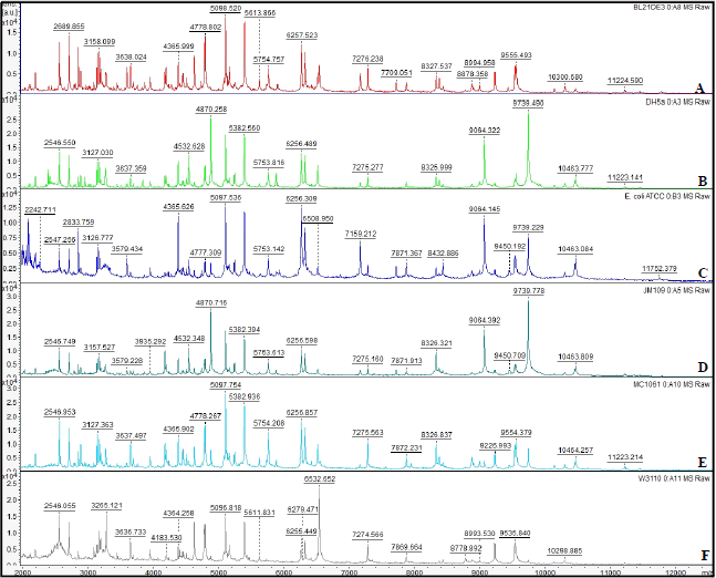 ![]() | Figure 2: Mass spectra obtained by MALDI-TOF analysis with total cellular protein extracts from different Escherichia coli lineages. The mass spectra were obtained within the range of 2000 to 20,000 m/z. The relative intensity of the ions is indicated on the Y axis and the profile of the obtained masses on the X axis. Panels A to F: Mass spectra generated from Escherichia coli BL21DE3+, Escherichia coli DH5α, Escherichia coli ATCC 8739, Escherichia coli JM109, Escherichia coli MC1061 and Escherichia coli W3110 strains, respectively. [Click here to view] |