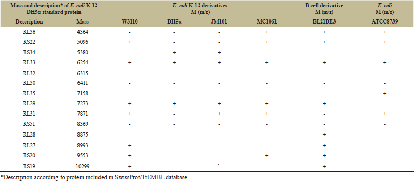 ![]() | Table 3: Analysis of the presence or absence of the most reproducible peaks corresponding to masses of Escherichia coli K-12 DH5α ribosomal proteins described in the literature compared to the Escherichia coli strain peaks of this study. [Click here to view] |