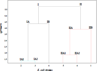 Characterization of the genetic profile of Escherichia coli strains was performed using genomic DNA polymorphism analysis. Preserved ERIC-1 5’TGTAAGCTCCTGGGGATTAAC3’ and ERIC-2 5’AAGTAAGTGACTGGGGTGAGCG3‘ primers were used in PCR reaction for sequences of enterobacterial repetitive intergenic consensus described in the literature [11]. The reactions were carried out in a mix containing 2x Go taq Green Master Mix® (Promega, Corporation, USA), MgCl2 (2.5 mM), 10 μM of each primer and 50 ng of bacterial DNA in a final reaction volume of 50 μl. The amplification conditions were those described by Duan et al. (2009) [11]. The amplicons were visualized in 1.5% agarose gel stained with ethidium bromide and photo documented. The analysis of the amplification profiles was performed visually by two observers and transformed into binary data in a matrix, according to the presence (1) or absence (0) of bands. In order to evaluate the genetic relationship among Escherichia coli strains, the matrix was subjected to multivariate statistical analysis “Cluster Analysis” through the complete linkage method to calculate the Euclidean distance and generate a dendrogram using statistical software Minitab v. 1.6.