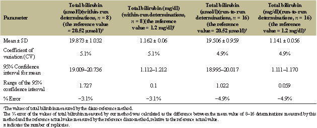 The method provided reproducible results of TB at the rates of 5.1% and 4.9%, respectively, indicating the high reproducibility of this method. The small ranges of 95% confidence intervals indicate the high precision of the mean values, while the small CV indicate the high precision of individual values, determined by this method. The within-run precision of the method is relatively high (CV 5.1%) and between-run precision is also high (CV 4.9%) at TB concentration of 20.52 μmol/L (1.2mg/dl). While the reproducibility and precision of the method are higher (CV 3.65%) at TB concentration of 49.59 μmol/l (2.9 mg/dl). On the other hand, the small values of % error (3.1%–4.9%) indicate the high accuracy of the method.