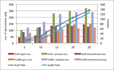 There is an increase in the water solubles with incubation period which indicates the degradation of lignocellulosic components into low molecular weight components. A loss in total organic matter (TOM), cellulose, hemicellulose, and lignin, and water solubles was analyzed according to the method of Datta [17] (Table 2). A comparison between TOM loss and loss in cellulose, hemicellulose, and lignin is shown in Figure 2. A strong correlation existed between TOM loss and lignin, cellulose, and hemicellulose loss. A strong positive correlation of 0.921 (ALW) and 0.964 (ALB) was noted between lignin loss and TOM loss. A correlation of 0.959 (ALW) and 0.863 (ALB) was observed between cellulose loss and TOM loss. Hemicellulose loss and TOM loss when compared had shown a correlation of 0.713 (ALW) and 0.905 (ALB). It can be noted that lignin, cellulose, and hemicellulose loss contributed to TOM loss. Although LiP activity was low in A. niger, it degraded lignin efficiently, which indicates that other ligninolytic enzymes (MnP, Vp, etc.) may be responsible for lignin degradation. On the whole, A. niger exhibited a good cellulase and xylanase activity using A. lebbeck fruit pods as a substrate.