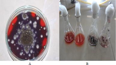 ![]() | Figure 3: (A) Decolorization of Congo red on solid media and (B) liquid media. [Click here to view] |