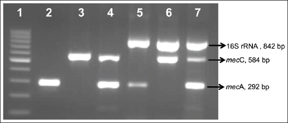 | Figure 1: Standardization of multiplex polymerase chain reaction. Lane 1: 100 bp marker; Lane 2: mecA positive; Lane 3: mecC positive; Lane 4: mecC and mecA positive; Lane 5: Staphylococcus and mecA positive; Lane 6: Staphylococcus and mecC positive; Lane 7: Staphylococcus, mecC and mecA positive [Click here to view] |