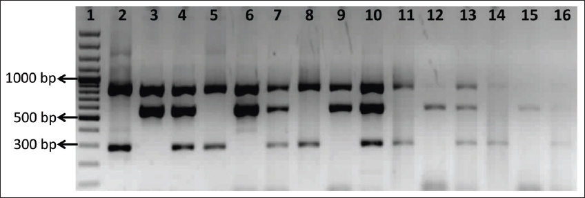 | Figure 2: Analytical sensitivity of the multiplex polymerase chain reaction. Lane 1: 100 bp ladder; Lane 2-4: 1000 ng/mL (Lane 2: Staphylococcus and mecA, Lane 3: Staphylococcus and mecC, Lane 4: Staphylococcus, mecA, and mecC); Lane 5-7: 100 ng/mL (Lane 5: Staphylococcus and mecA, Lane 6: Staphylococcus andmecC, Lane 7: Staphylococcus, mecA, and mecC); Lane 8-10: 10 ng/mL (Lane 8: Staphylococcus and mecA, Lane 9: Staphylococcus andmecC, Lane 10: Staphylococcus, mecA, and mecC); Lane 11-13: 1 ng/mL (Lane 11: Staphylococcus and mecA, Lane 12: Staphylococcus andmecC, Lane 13: Staphylococcus, mecA, and mecC); Lane 14-16: 0.1 ng/mL (Lane 14: Staphylococcus and mecA, Lane 15: Staphylococcus and mecC, Lane 16: Staphylococcus, mecA, and mecC) [Click here to view] |