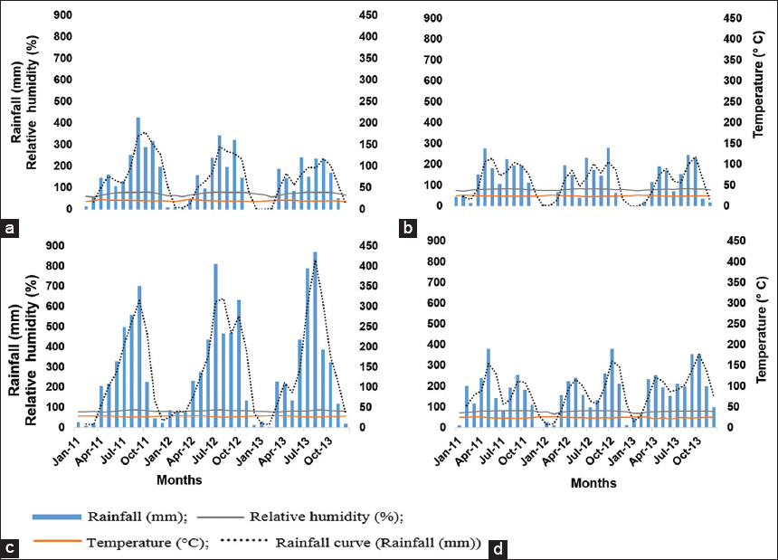 | Figure 1: Meteorological data for the different study sites from 2011 to 2013. (a) Foumban (AEZ III), (b) Makenene (AEZ V), (c) Njombe (AEZ IV), and (d) Yaounde (AEZ V) [Click here to view] |