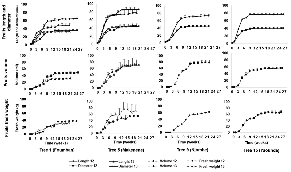 In all the sites, the fruit length, diameter, volume, and fresh weight kinetics were sigmoidal [Figure 3]. Fruits reached the maximum value of these morphological parameters, respectively, listed, between 8.25 ± 2.5 and 15 ± 1.63; 9.75 ± 0.96 and 13.5 ± 1; 10.75 ± 1.26 and 14.5 ± 1.91; 12.75 ± 4.92; and 17 ± 4.32 weeks [Table S1].