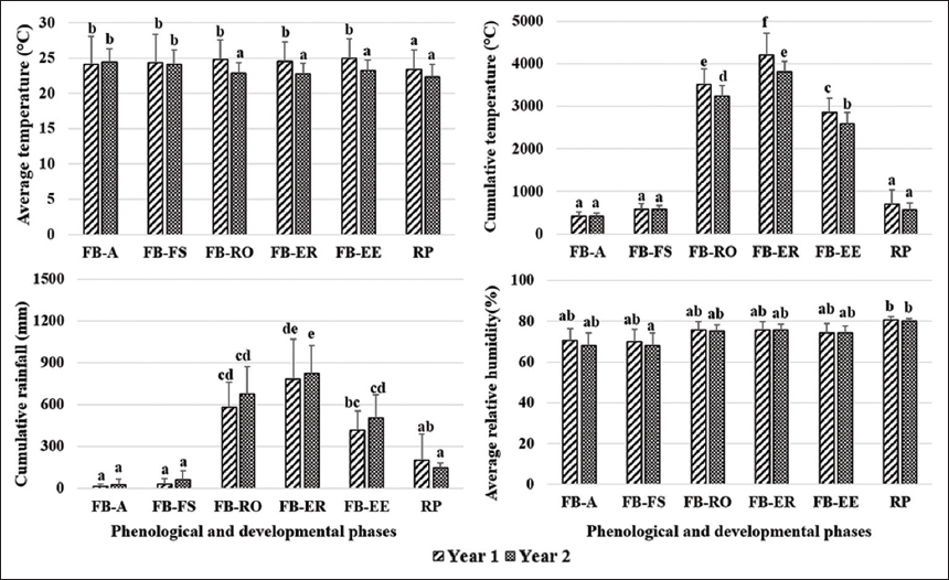 | Figure 5: Comparison of climatic parameters recorded during the different phenological and developmental phases in two consecutive Dacryodes edulis fruits production seasons. FB-A: Floral bud emergence and anthesis, FB-FS: Floral bud emergence and fruit set, FB-RO: Floral bud emergence and ripening onset, FB-ER: Floral bud emergence and end of ripening, FB-EE: Floral bud emergence and end of elongation, RP: Ripening period. The bars bearing the same letter are not significantly different at 5% probability level [Click here to view] |