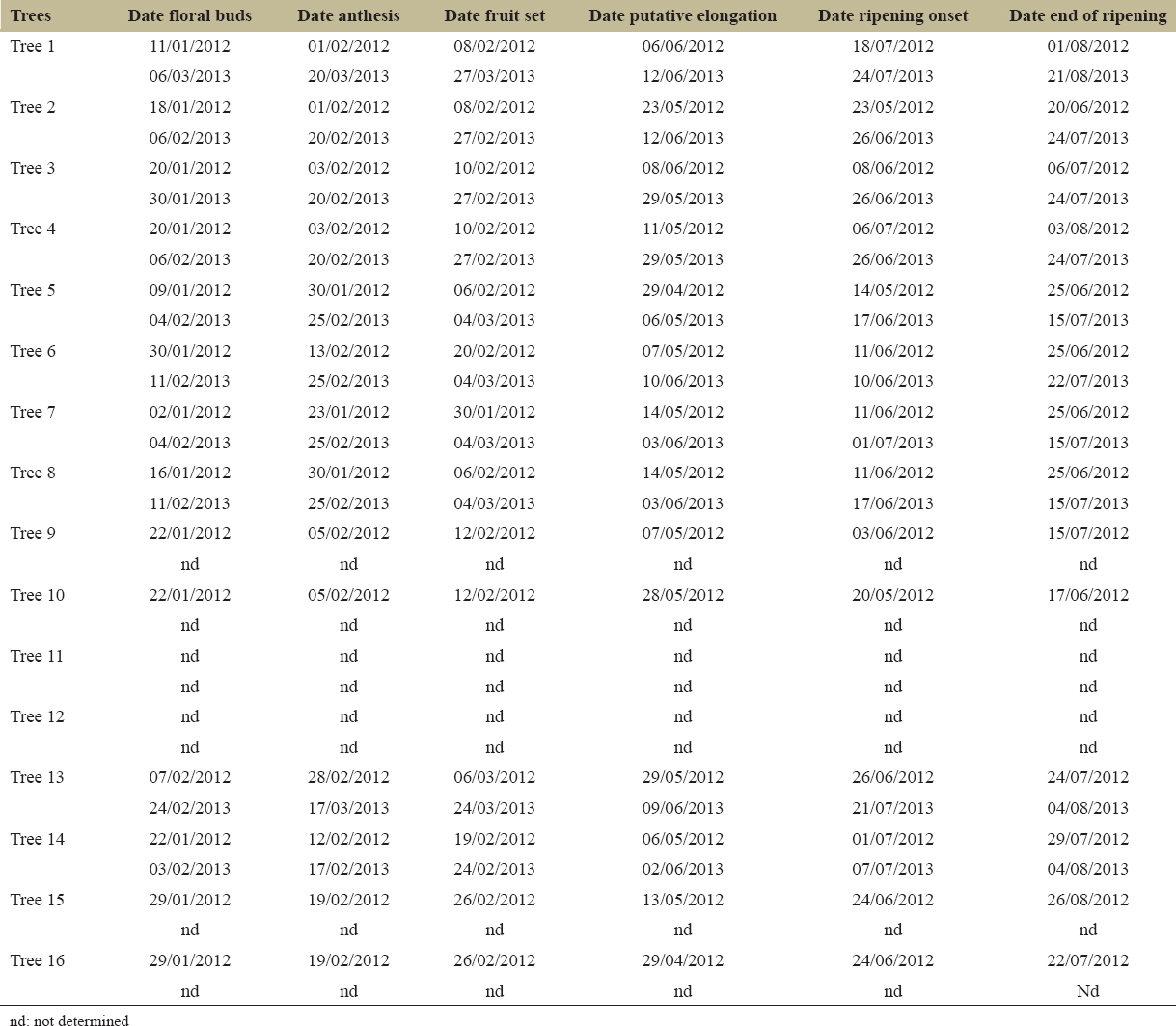 | Trees | Date floral buds | Date anthesis | Date fruit set | Date putative elongation | Date ripening onset | Date end of ripening |