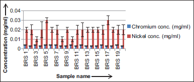 ![]() | Figure 4: Cr(VI) and Ni(II) concentration in bacterial isolates – Standard deviation graph of chromium and nickel concentration in bacterial species. [Click here to view] |