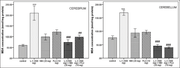 Administration of L camara significantly increased protein oxidation in both cerebrum (P < 0.001) and cerebellum (P < 0.01) in comparison to the control [Figure 6]. The increase in PC was more pronounced in cerebrum than in cerebellum. Mice co-administered with NIM (P < 0.01) and FLU (P < 0.01. P < 0.05) showed significant decrease among the treated group.