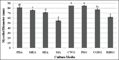 ![]() | Figure 2: Mycelial growth diameter of Lentinus swartzii on the different culture media at pH 6 in 4 days of incubation. PDA: Potato dextrose agar; MEA: Malt extract agar; SDA: Sabouraud dextrose agar; MA: Mycological agar; CWG: Coconut water gulaman; PSG: Potato sucrose gulaman; CGSG: Corn grit sucrose gulaman; RBSG: Rice bran sucrose gulaman. Means with the same letters of superscript are not significantly different according to Tukey’s HSD (P < 0.05). [Click here to view] |