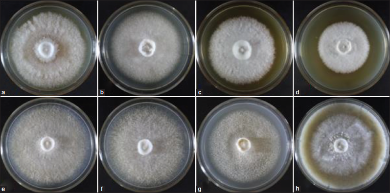 ![]() | Figure 3: Mycelial growth of Lentinus swartzii on the different culture media: (a) PDA, potato dextrose agar; (b) MEA, malt extract agar; (c) SDA, Sabouraud dextrose agar; (d) MA, mycological agar; (e) CWG, coconut water gulaman; (f) PSG, potato sucrose gulaman; (g) CGSG, corn grit sucrose gulaman; and (h) RBSG, rice bran sucrose gulaman on the 4th day of incubation. [Click here to view] |