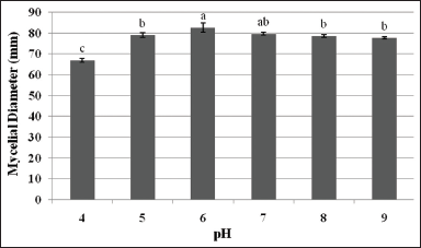 For practical and economical reasons, CWG was used as the basal medium in the evaluation of pH requirement of L. swartzii mycelia. In the present study, the effect of six pH levels of CWG on the mycelial growth of L. swartzii was determined. Noticeably, the favorable growth of L. swartzii was obtained in the range of pH 5–9, but exceedingly favorable at pH 6 [Figure 4]. All cultures produced thick mycelial growth [Figure 5]. This observation is in conformity with that of L. strigosus and O. radicata that could grow at a wide range of pH, but their maximum mycelial growth was recorded at pH 6 [6,23]. However, the mycelia L. tigrinus grew best on CWG at pH 7-8 [5]. In liquid culture, the maximum mycelial biomasses of G. lucidum, P. cystidiosus, V. volvacea, and S. commune were obtained at pH 7, 7, 6, and 8, respectively [24]. On the other hand, although lower mycelial growth diameter of L. swartzii was noted at pH 4, it is interesting to note that the mycelia could favorably grow (as shown by thick mycelial density) even at the acidic state of the medium. The results of the present study suggest that L. swartzii is not pH sensitive, thereby, could grow within a wide range of pH.
