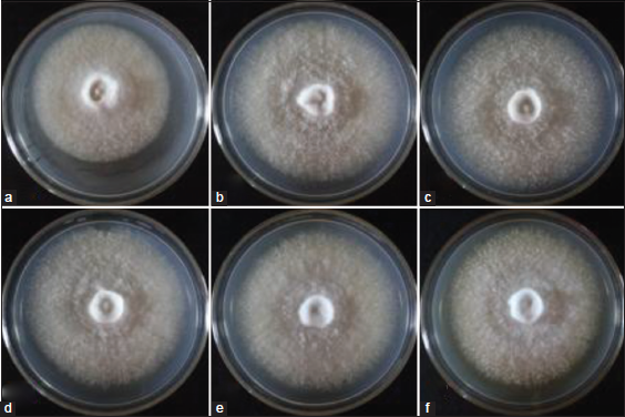 ![]() | Figure 5: Mycelial growth of Lentinus swartzii on Coconut water gulaman at different pH levels: (a) pH 4; (b) pH 5; (c) pH 6; (d) pH 7; (e) pH 8; and (f) pH 9 on the 4th day of incubation. [Click here to view] |