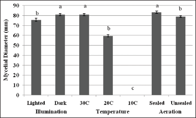 ![]() | Figure 6: Mycelial growth diameter of Lentinus swartzii on Coconut water gulaman at pH 6 as affected by illumination, temperature, and aeration conditions in 4 days of incubation. Means with the different letters of superscript within the same condition are significantly different according to Tukey’s HSD and t-test (P < 0.05). [Click here to view] |
