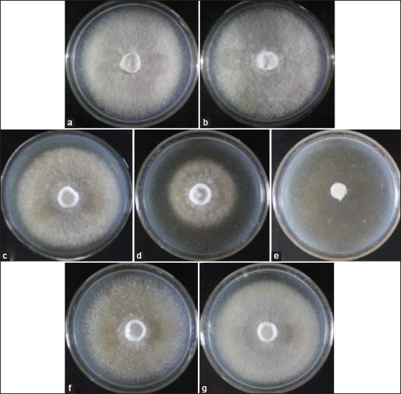 ![]() | Figure 7: Mycelial growth of Lentinus swartzii on coconut water gulaman at pH 6 as affected by illumination ([a] lighted and [b] dark), temperature ([c] 30°C, [d] 20°C, and [e] 10°C]) and aeration ([f] sealed and [g] unsealed) conditions on the 4th day of incubation. [Click here to view] |