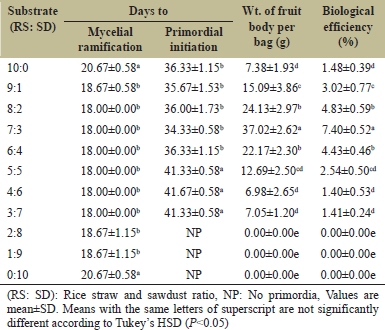 ![]() | Table 1: Time periods of mycelial ramification and primordial initiation, weight of fruiting bodies, and biological efficiency of Lentinus swartzii on rice straw and sawdust based substrate. [Click here to view] |