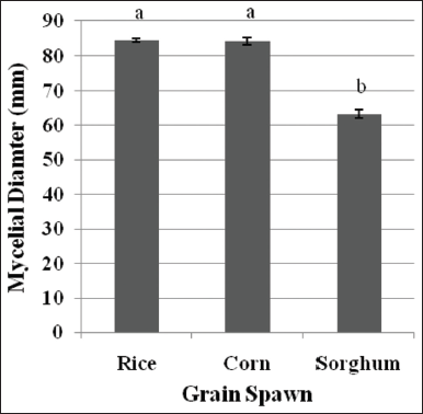 ![]() | Figure 8: Mycelial growth diameter of Lentinus swartzii on the three spawning materials in 5 days of incubation. Means with the same letters of superscript are not significantly different according to Tukey’s HSD (P < 0.05). [Click here to view] |