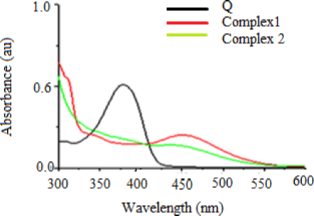 The UV–visible spectra of Q, complex 1, and complex 2 were determined in the DMSO solution (Fig. 3) and the spectra of complex 1 and 2 relevant to the spectra of ligand, i.e., Q. The absorption band of ligand (379 nm) shifted toward a longer wavelength (bathochromic shift), i.e., at 450 and 452 nm, respectively, in complex 1 and 2. This band-moving is expected to π–π* progress of Q and phenanthroline ligands concerning Q cinnamoyl band giving the development of metal–oxygen bond in ring C and cooperation of 3-OH group in the chelation [31].