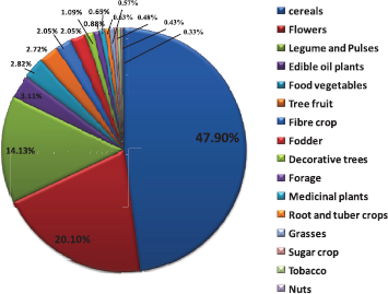 The conventional plant breeding methods are very effective in many crops including cereals and pulses and have been using since long to improve the yield and other characters in these crops. But these conventional breeding methods are not very much successful and take a long period for improvement in high yield of biomass and increase in the active principles in medicinal and aromatic crops due to low genetic variability. Hence, induced mutagenesis has been proved as an important approach for creating the genetic variation and diversity in these crops to overcome from these bottleneck conditions. Induced mutagenesis can utilize the potential of plant genetic resource to create variability which is available to plant breeders as raw material to generate new crop variety and these varieties can provide a significant contribution for sustainable crop production. The contribution of mutation breeding in medicinal and aromatic crops is less than one percent which is comparatively very less as compared to cereals (48%), flowers (22%), and legumes (15%) [22] (Fig. 1). There is scope for improvement in medicinal and aromatic crops through mutation breeding in terms of enhancement of important features like new colors and shapes of flower, plant morphology, flowering times, postharvest quality, biotic and abiotic stress tolerance, and alkaloid content in short time with low cost. The mutation breeding was successfully done in several spices, flower species, grasses, and wild species that come under medicinal and aromatic plants to improve several characters like yield, alkaloid contents, disease resistance, etc. (Table 1). In this review, some cases out of those several mutagenesis studies in medicinal and aromatic plants are discussed.