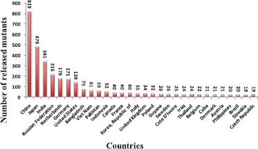 ![]() | Figure 2: Country wise distribution of officially released mutants. Only top 30 countries were taken to make this bar diagram. Data collected from MVD 2021 (https://mvd.iaea.org/#!Search) accessed on Jan 20, 2021. [Click here to view] |