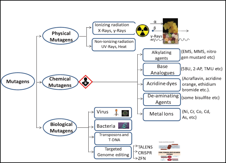 Mutations are responsible for creating genetic variability in several crops naturally or artificially induced. Several physical and chemical mutagens are being used to induce artificial mutations [14,15]. Physical mutagens include various types of radiations like X-rays, gamma rays, neutrons, beta particles, alpha particles, proton or deuterons, UV rays, etc. (Fig. 3). The chemical mutagenesis is caused by several chemicals like alkylating agents [ethyl methane sulfonate (EMS), Methyl methanesulfonate, nitrogen mustard, etc..], base analogues [Bromo uracil (5BU), aminopurine (2AP), Tetramethyl Urea (TMU), etc..], Acridine dyes (Acriflavine, acridine orange, ethidium bromide, etc.). Another category for tool for mutagenesis is the use of biological agents such as transposons, retrotransposons, and T-DNA [16,17]. The genome editing systems like transcription activator-like effector nucleases (TALENS) and clustered regularly interspaced short palindromic repeat (CRISPR) induce target mutations and can be used as an alternative mutagen [18] (Fig. 3). These chemicals have chromosome damaging effects on plants by oxygen derived radicals; these effects can occur both spontaneously and artificially following induction through mutagens [9]. There are several mutagens available for crop improvement and each has its own important role as positive or negative effect on crops [19].