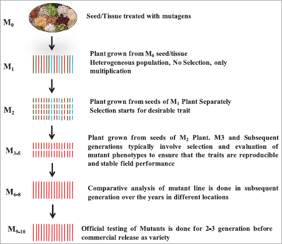 Several steps are involved in the process of induced mutagenesis (Fig. 4). The first step involves irradiation or chemical treatment of the seeds or any tissue of the parent variety and this material is designated as M0. These Mutagenic treatments can induce some chromosomal rearrangements or can make some changes in genes at the nucleotide level to develop other allelic forms. This alteration may be responsible for the change in one or more specific characters in the M1 generation which is grown from mutagenized seed or tissue (M0). The population of M1 generation is homogenous type as the plants may have a different effect of allelic mutation. Genetically, Ml mutant plants are heterozygous in nature as in most of the cases only one allele is affected by one mutation during treatment. The occurrence of having mutation in both alleles of a gene is extremely low and very rare. Moreover, only dominant mutations can be identified in M1, while it is impossible to identify a recessive mutation. Therefore, the selection is not done in M1 generation and plant breeders attempt screening mutations in subsequent generations where segregations occur. Now the seeds of M1 generation are used to create M2 generation [20]. The seeds of M2 generation are sown in experimental plots to obtain segregating M2 population which is subjected to various screening procedures for the selection of plants with desired characters. The selected plant material of M2 is further grown on as the M3 generation. Usually, M3–5 generations are used to screen the quantitatively inherited characters, homozygosity, and stability in field performance on a line or a single plant basis. These selected promising homozygotic mutants can multiply directly in the field in subsequent generations M6–8 and comparative analysis is also done with checks in different locations. After the multiplication of seed and different location testing, the mutants can go for official testing before release as mutant variety (Fig. 4). Further, these lines can be used as breeding material in a cross breeding program [20,21].