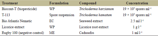 First, in vitro as lab-bioassay, by preparing 1 ml of the J2 suspension in a 50 mm Petri dish and 1 ml of substances, the five treatments (Table 1) were added to a Petri dish separately with the recommended concentration in triplicate. The control treatment contained J2 with distilled water only. All Petri dishes were covered with plastic bags and incubated at 26°C±2°C for 1, 3, 5, 7, 9, and 11 days, respectively. This experiment was repeated to confirm the results.
