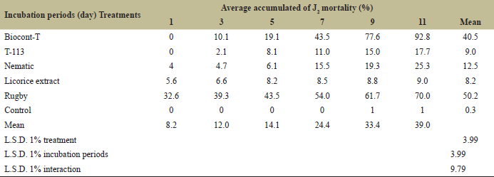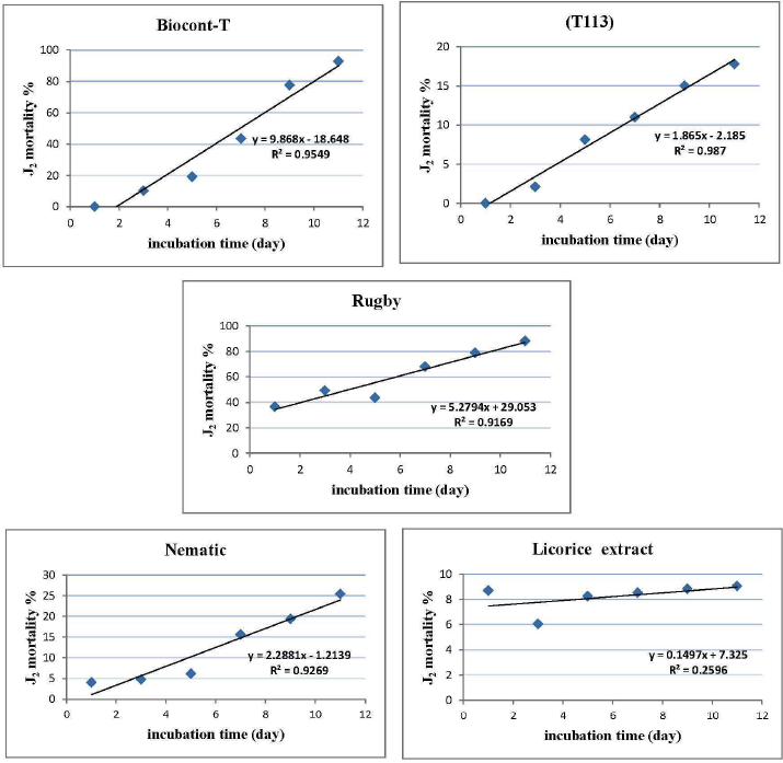 Regression analysis results showed a positive relation between all treatments and J2 mortality during incubation periods. Y demonstrated that incubation periods at 26°C±2°C will increase the percentage of J2 mortality, while linear relation for treatments (Fig. 1) referred to a significant relation between the accumulated J2 mortality and incubation period. This was shown by the positive value of factor R2 which reached the highest value in treatments T-113 and Biocont-T with 0.987 and 0.954, respectively, and without any significant differences from treatment with nematic with 0.926, in addition to licorice extract.