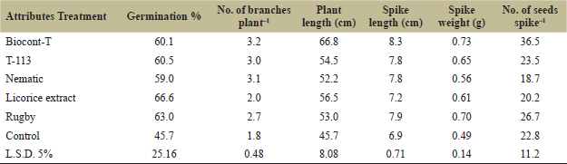 The results of the field-bioassay in the pots revealed that treatments had a significant effect on the growth and yield of wheat plants that were inoculated with galls (Table 3). It was found that the Biocont-T showed a significant effect on the J2 mortality reflex on the growth of wheat attributes such as germination percentage, number of plant branches, plant length, spike length, and seed weight and number of seeds in each spike of 60.1%, 2.3 branch plant–1, 66.8 cm, 8.3 cm, 0.73 g, and 36.5 seed spike–1, respectively. Meanwhile, there was limited improvement in germination percentage as a result of using Trichoderma in both treatments with Biocont-T and isolate T-113 with 60.1% and 60.5%, respectively.
