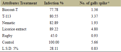 The infection percentage results were reflected on average galls per spike. This has shown that all plants whose seeds were treated with Biocont-T contain the lowest number of galls in their spikes of 1.36 (Table 4). Nematic was also shown to be effective with 1.93 galls per spike. The other treatments had variable effects compared to the control treatments which were 5.66 galls per spike.