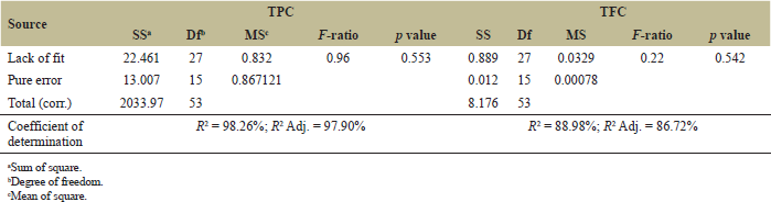 Optimization of the dried banana peel extraction process was performed with 18 runs and 3 repetitions. The TPC and TFC obtained in the extract ranged from 46.01 to 62.88 mgGAE/g and from 5.54 to 7.44 mgQE/g, respectively. Model fitting plays an important role in explaining the accuracy of the RSM mathematical models, predicting the optimal value of the variance and the interaction between the selected parameters. The regression models obtained using the RSM for analysis of variance are presented in Table 3. The coefficient of determination (R2) is a measure of goodness of fit [22]. This investigation revealed that the R2 for TPC and TFC were 0.98 and 0.89, respectively, indicating that 98% and 89% of the trial’s TPC and TFC could match those predicted by the models accordingly. The RMSE value is a measure of the standard deviation of the prediction errors and the lack of fit is an indicator of the null hypothesis. The fit of the model was also evaluated through the p value of lack of fit. A good correlation model should have a good fit between the actual data and the model’s predictions; therefore, a model built with a statistically significant lack-of-fit test is desirable [23]. The lack of fit of the TPC and TFC models has a p value > 0.05 (Table 3), so the fit of the model is very high. In addition, the p value, which represents the confidence level of the models, is significant because the p value of the models is less than 0.05, which further confirms the reliability of the models with predictive responses in the current study [24].