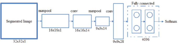 The CNN is a matrix input-based classifier; so, we convert the segmented image into a gray scale image as a 32 × 32 matrix, which is given as an input image for CNN classification. The layer definition of the proposed CNN is defined below.
