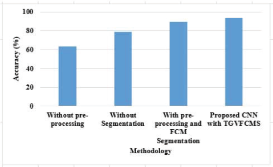 After that, the data set is trained with pre-processing and existing FCM segmentation, which is compared with our proposed TGVFCMS with CNN. Figure 6 shows the proposed method accuracy.