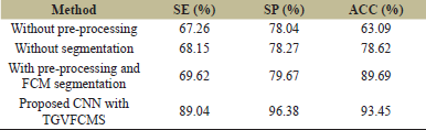From Table 1 and Figure 6, it is clear that CNN without pre-processing achieved only 67.26% of SE, 78.04% of SP, and 63.09% of ACC. The same CNN method increased 2% of SE and SP by training without segmentation. However, CNN trained with FCM segmentation and pre-processing achieved nearly 69% of SE, 79% of SP, and 89.69% of ACC. The SE, SP, and ACC are gradually increased (nearly 13%–17%) when the classifier CNN is trained with TGVFCM segmentation technique. This proves that our proposed hybrid segmentation technique of FCM achieved better performance than the existing FCM. Table 2 shows the performance analysis of CNN with other existing machine learning and deep learning practices; Figure 7 shows the graphical representation of CNN in terms of accuracy.