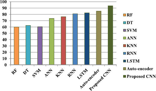 Here, the existing techniques, including LSTM, RF, ANN, DT, SVM, KNN, RNN, and auto-encoder, are compared with the CNN technique. Among these techniques, RF and DT achieved very low performance in terms of SE, SP, and ACC. The SVM, KNN, and ANN achieved nearly 63% of SE, 65%–70% of SP, and 71% of ACC, whereas RNN achieved better performance than LSTM in terms of SE. Auto-encoder achieved high performance than RNN and LSTM in terms of all metrics. But, the proposed CNN technique achieved 890.4% of SE, 96.38% of SP, and 93.45% of ACC. This is because CNN is trained with TGVFCMS segmentation technique, which has better performance than the other existing techniques.