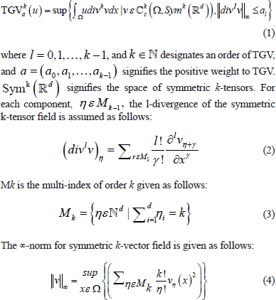 After pre-processing, the segmentation is carried out. TGVFCMS technique is robust to noise and edge-preserving. Regularization of TGV images up to a specific order of separation is particularly beneficial for measuring image attributes like noise removal and edge sharpness. Our TGVFCMS was developed to include TGV regularization in the smoothing term in order to minimize undesirable noise and artifacts from FCM-based approaches. The following is the framework of TGV: