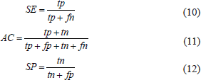 For classification, the assessment criteria comprise sensitivity (SE), specificity (SP), and accuracy (AC). The performance criteria are defined as follows: