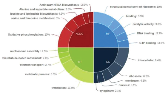 Next performed Blastx for our data with uniport database and the resulting top 5 abundant Gene ontology categories and Kyoto Encyclopaedia of Genes and Genomes (KEGG) pathways for significantly differential genes were shown in the form of Pie donut using High charts tool.