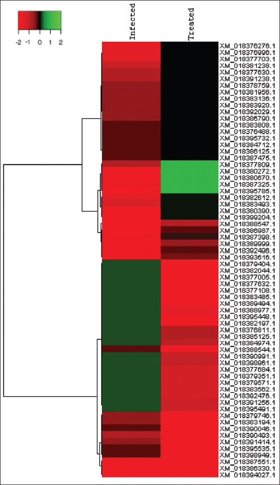 ![]() | Figure 2: HeatMaps were created using Cluster 3.0 and Java TreeView (v 1.1.6) for Top 30 significantly upregulated and Top 30 significantly downregulated genes for treated versus infected. [Click here to view] |