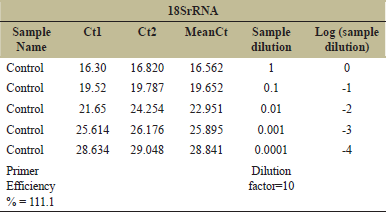 The analysis for primer efficiency calculation is based on the following parameters: Five different dilutions of the sample (control) were taken for the analysis (1, 1:10, 1:100, 1:1000, and 1:10000). Mean CT value for the different dilutions was plotted in Y-axis against the log10 (1/Sample dilution) value in X-axis. The slope value was noted and used in the following equation for the efficiency % calculation: (10^(−1/The Slope Value).