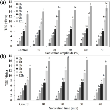 ![]() | Figure 1: Effect of sonication amplitude (a) and sonication time (b) on the sugar syrup production from broken Ricebery rice by ultrasound?assisted enzyme hydrolysis. [Click here to view] |