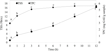 ![]() | Figure 2: Time course of sugar syrup production (TSS) and total phenolic content (TPC) from the hydrolysis of broken Ricebery rice by ultrasound?assisted enzyme hydrolysis. Different lowercase letters indicate significant (p < 0.05) differences among means. [Click here to view] |