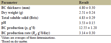 ![]() | Table 2: BC production parameters from broken Riceberry syrup by K. xylinus AGR 60 at room temperature for 4 days. [Click here to view] |