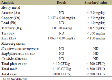 ![]() | Table 3: Analysis of heavy metals and contaminated pathogens in bacterial cellulose facial mask prototype. [Click here to view] |