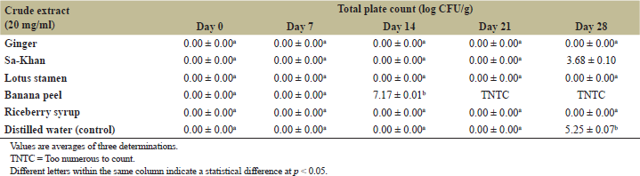 ![]() | Table 4: Total plate count of the BC samples during incubation at 25°C for 28 days with different crude extracts. [Click here to view] |