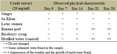 ![]() | Table 5: Physical changes of BC facial mask samples were incubated at 25°C for 28 days with different crude extracts. [Click here to view] |