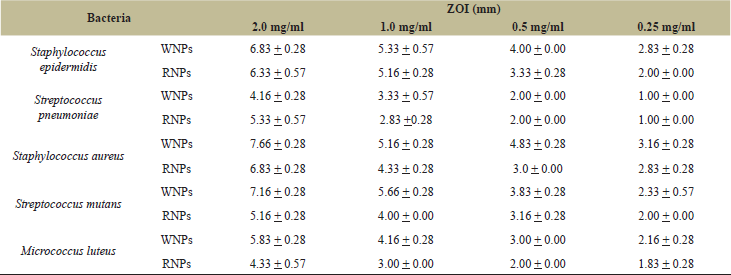 ![]() | Table 1: ZOI (mean ± SD) observed against various gram-positive bacteria by different concentrations of AgNPs (WNPs & RNPs). [Click here to view] |