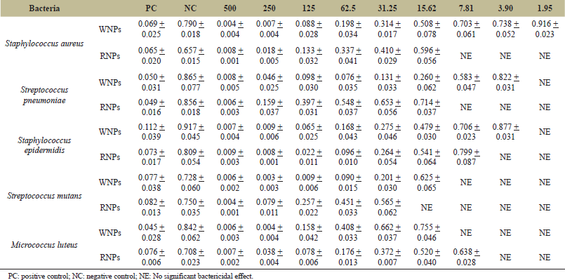 ![]() | Table 3: Measurement (O.D) of growth of different gram-positive bacteria at different concentrations (μg/ml) of WNPs & RNPs. [Click here to view] |