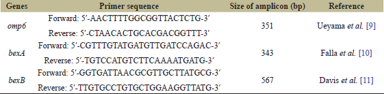 The PCR technique was used for differentiating H. influenzae isolates into typeable and nontypeable using the primer pair with the amplicon size specific to bexA and bexB genes. The itemized sequences of the primer sets are illustrated in Table 1, as previously described in [10,11] with some modifications.